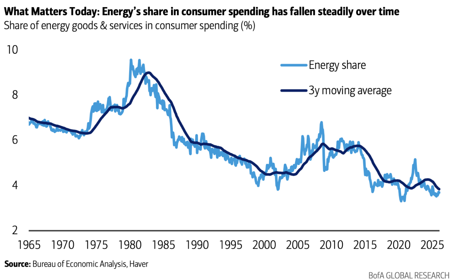 Energy’s share in consumer spending was just 4% as of Jan 2026 (Source: Aditya Bhave, BofA Research)